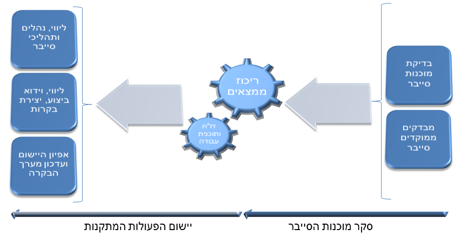 יש הטוענים, ובצדק לדעתינו, כי ארגון המקיים שגרת אבטחת מידע פרו-אקטיבית מקטין משמעותית ומונע את מרבית איומי הסייבר וכי אבני היסוד הם זהים. עם זאת, לאור ההשפעה הקריטית שיכולה להיות לאיומי סייבר, יישמנו באיי פי וי סקיוריטי מתודולוגיה ייחודית בת ארבע שלבים, המקשרת בין עולמות אבטחת המידע והסייבר, באחד מלקוחותינו הגדולים. עיקרי מתודולוגיה זו מתוארים באיור הבא: